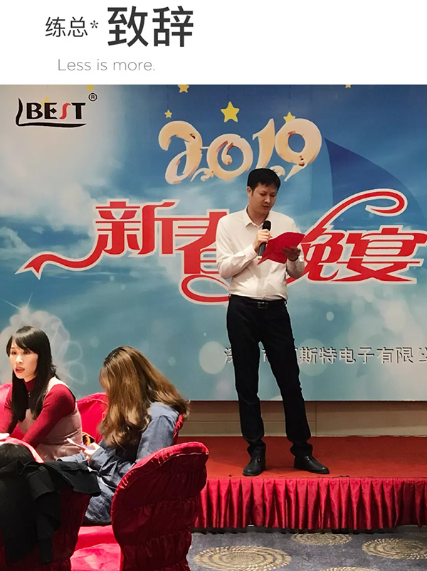 休息后,百斯特電子全員盛裝出席新春晚宴,晚宴在祥和而熱烈的氣氛中開始,首先由公司總經理練總致辭,在這辭舊迎新,歡聚一堂的時刻,練總首先向全體員工致以誠摯的祝賀!回首2018,全體員工不辭辛苦,兢兢業業。公司的業務節節高升,取得了有目共睹,可喜可賀的成績。2019公司將聚焦現有產品,發展新產品,只要我們滿懷信心,攜手共進,我們一定能創造一個更加美好的明天!